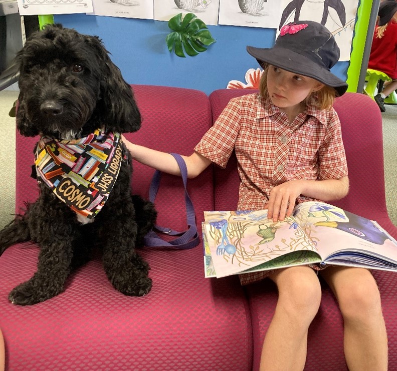 Cosmo, the library dog, is a regular visitor to the library. He usually visits one or two days a week. Cosmo is a Labradoodle/Moodle cross and has a non-shedding coat. He enjoys listening to children read to him and enjoys curling up in his favourite chair during lessons.